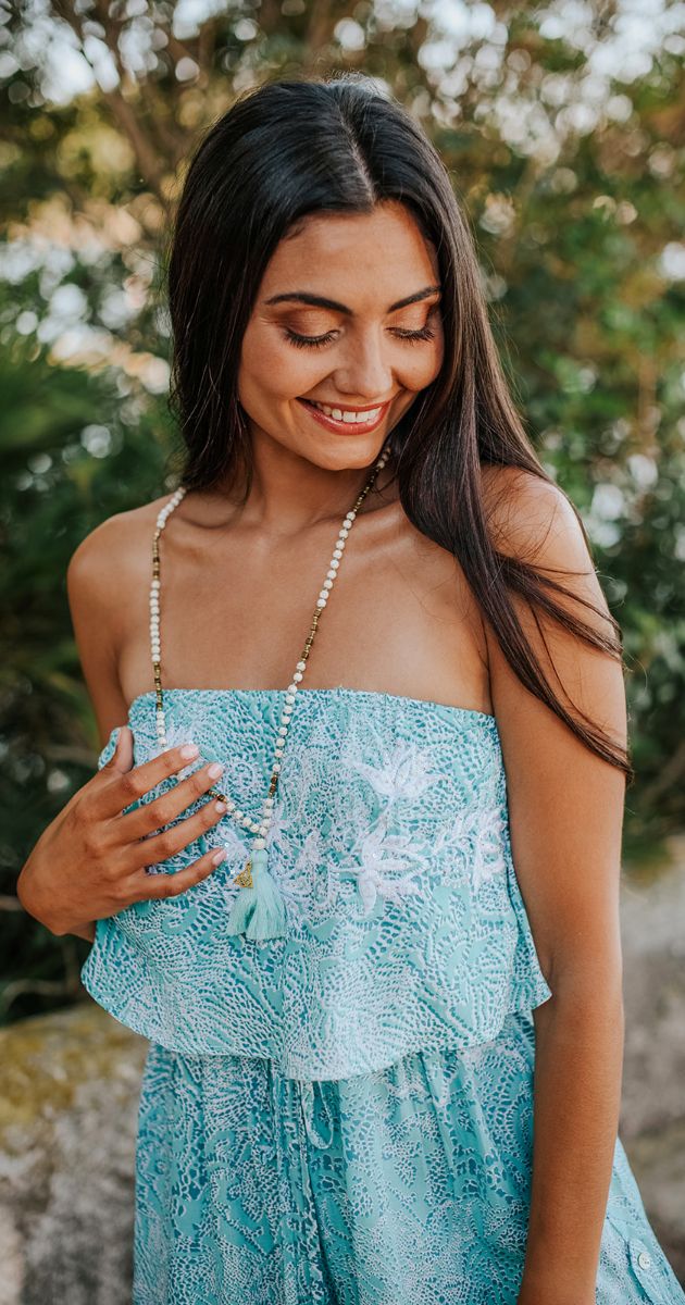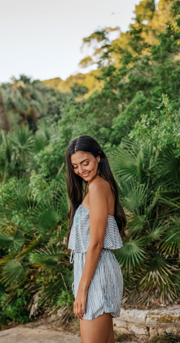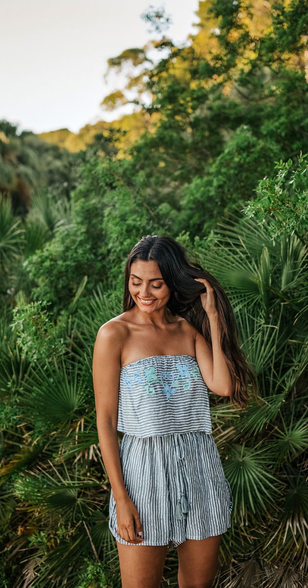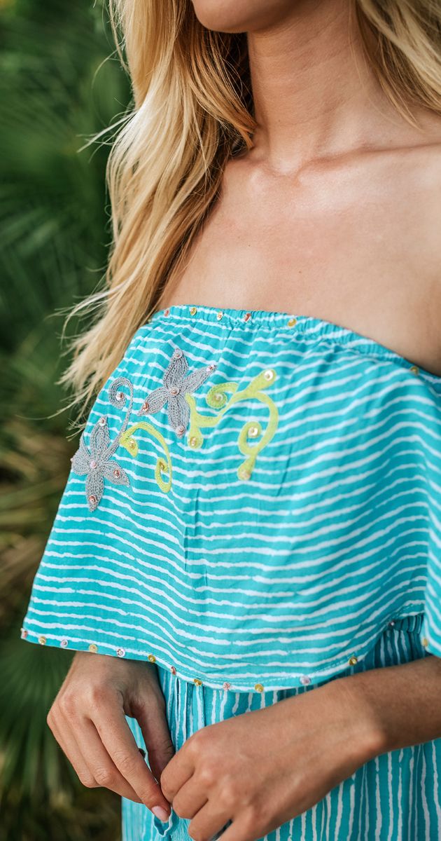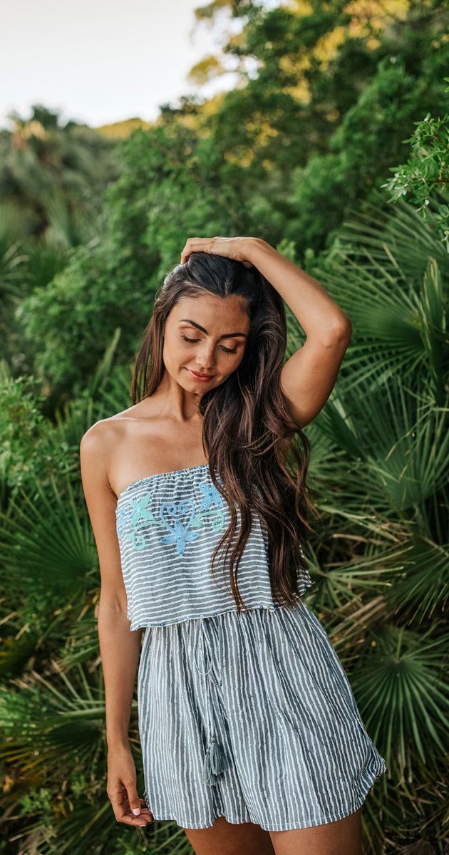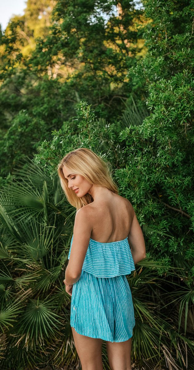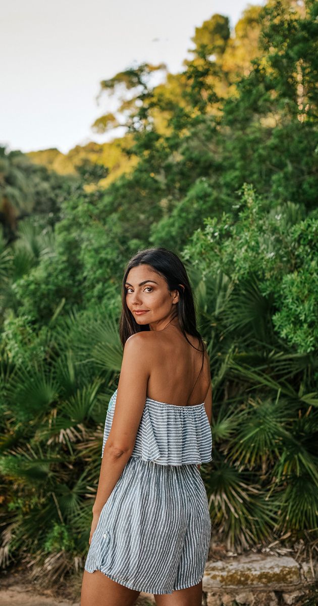 La combinaison courte Aysel nous rappelle la mode du bord de mer des côtes du Sud de la France dans les années 1930, avec ses fines rayures horizontales et ses broderies complexes sur la poitrine à volants. Elle est dotée d'un élastique à la taille pour un ajustement parfait et le joli nœud papillon au dos rend cette combinaison confortable tout à fait unique.