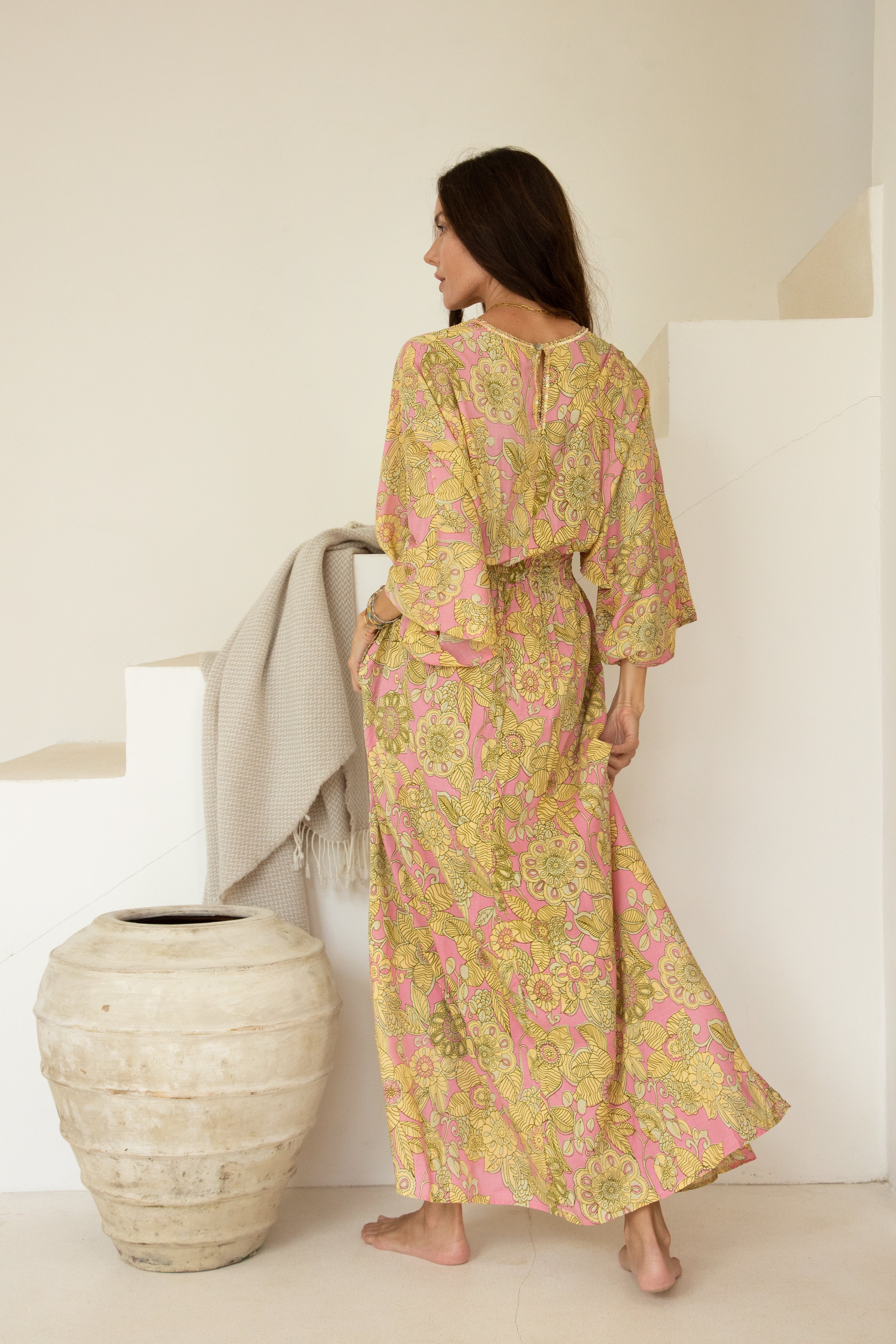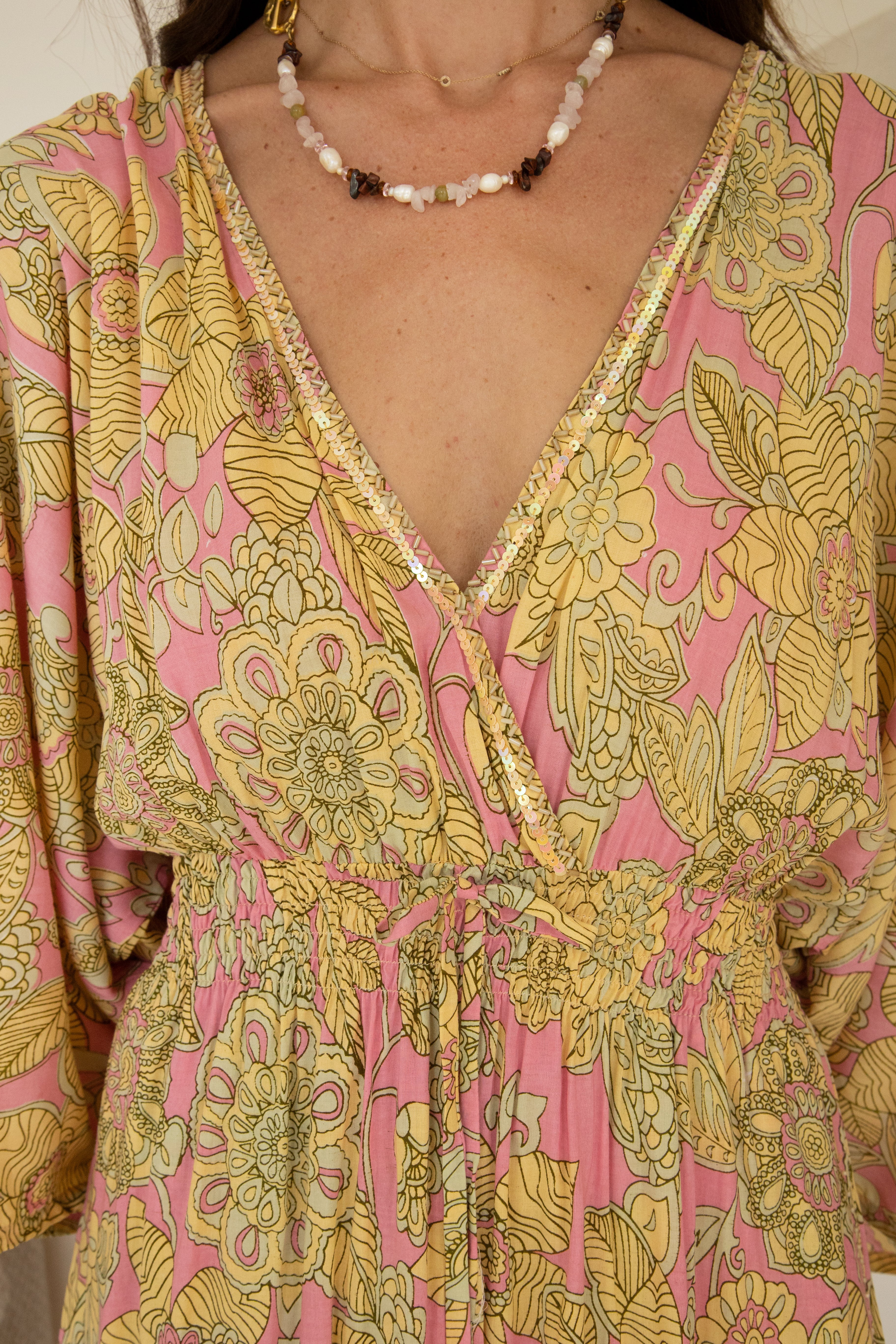 Featuring a vibrant flower print, the Birkley Kimono adds a pop of color and pattern to your ensemble. Its flowing silhouette and wide sleeves create a sense of fluidity and movement, allowing you to dance and sway with grace. Available in Pink and Turquoise.