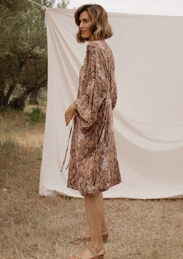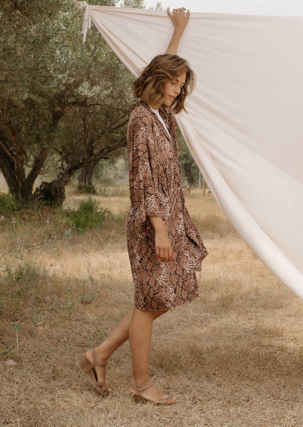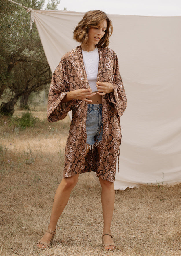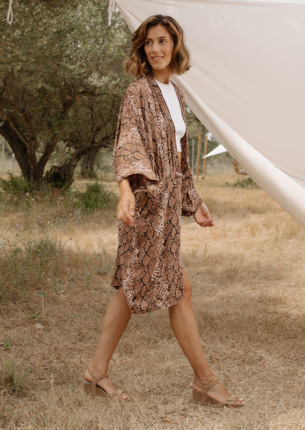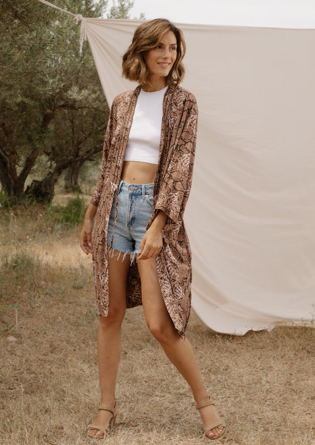 You can wear the Charo Kimono with short clothing, for example, bermuda shorts, so that it will highlight your figure.