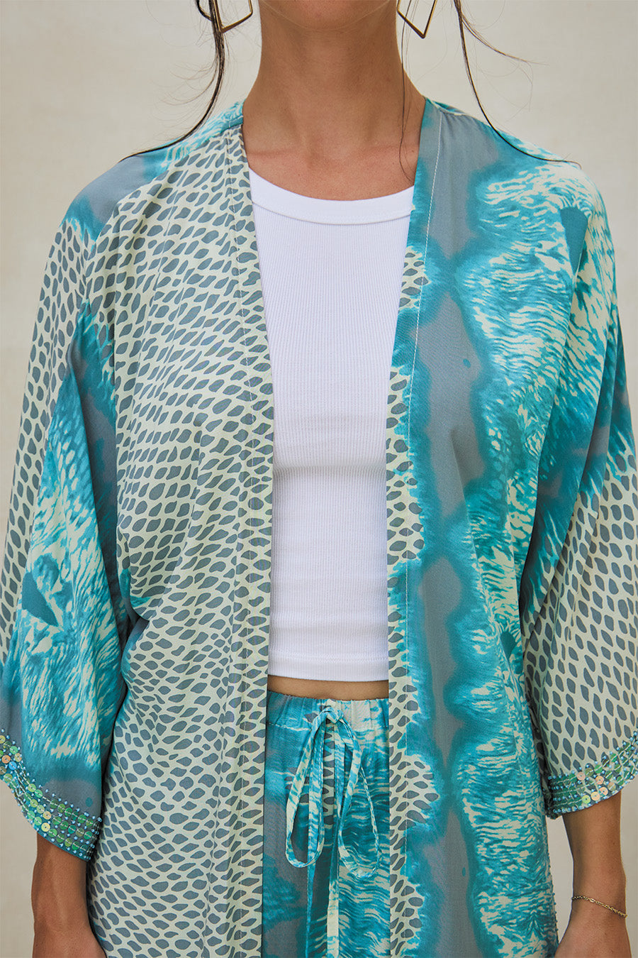 The Dahlia Kimono in Snake Lux Print is sleek, bold and full of attitude. With its fluid cut and soft blue/grey tones, it's perfect for layering with effortless elegance.