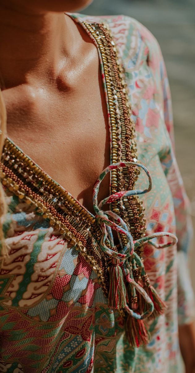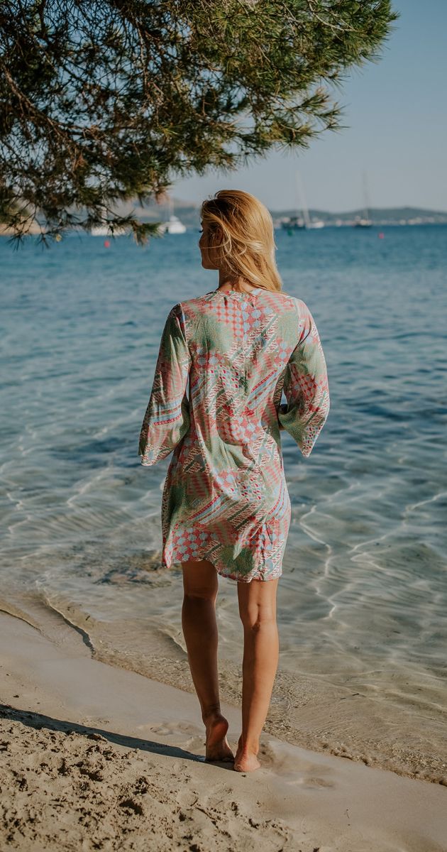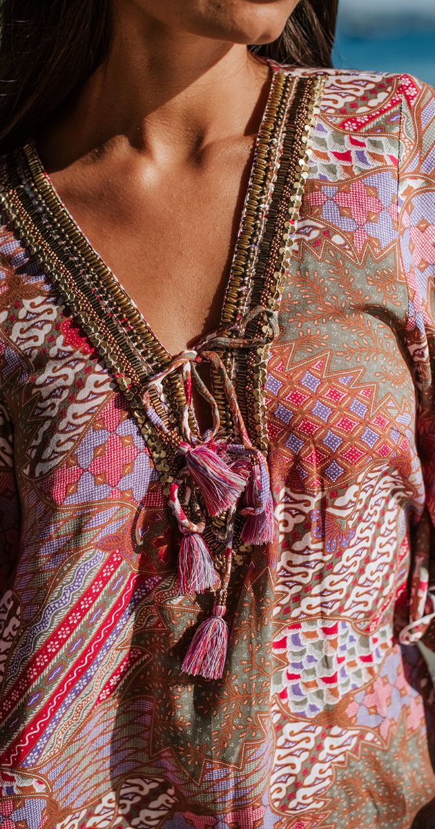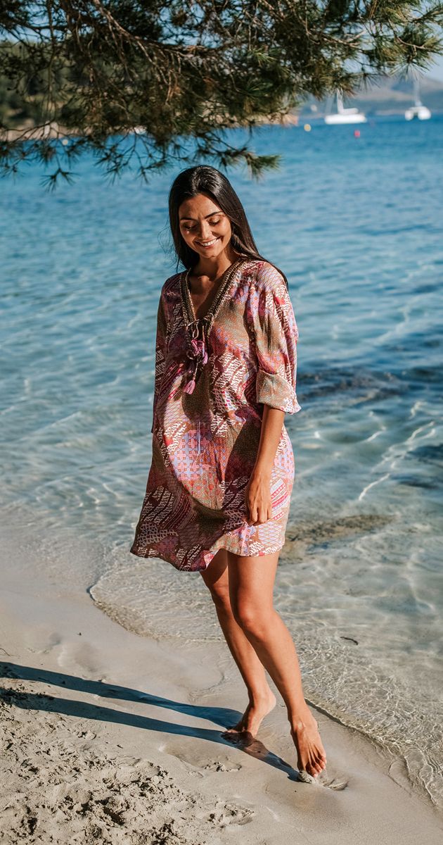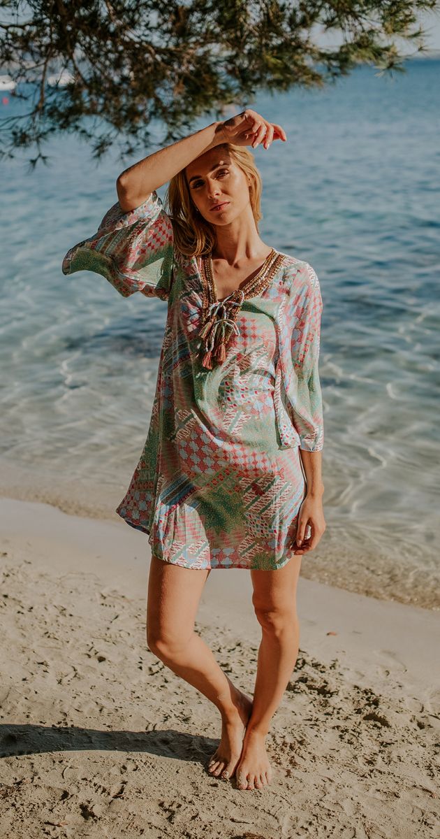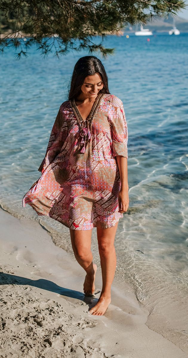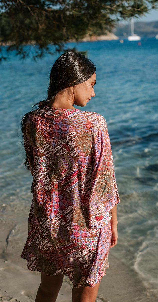Voici la tunique courte Diana dans un imprimé ethnique spécial avec de nombreux motifs différents.