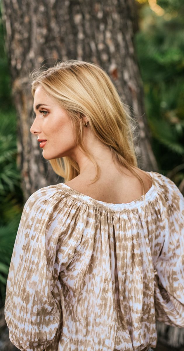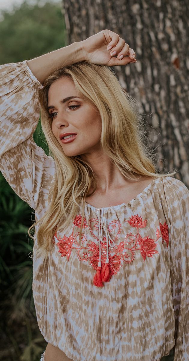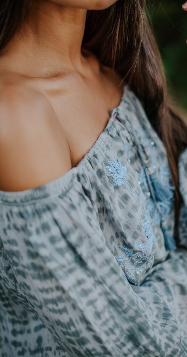 Le chemisier sexy Irelia en batik de type peau d'animal est le haut d'été parfait. Une magnifique broderie à la main sur la poitrine, une taille et des manches élastiques pour le porter haut ou bas, aussi révélateur que vous le souhaitez.