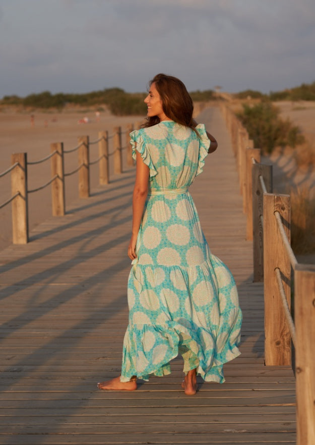 Cette silhouette vintage Hippy Chick Ibiza est flatteuse, polyvalente et belle sans effort - c'est la robe parfaite de jour comme de nuit. Doté d'un corsage enveloppant serré et d'une jupe longue décontractée avec des ourlets à volants dans des teintes exquises de bleu de la mer Méditerranée.