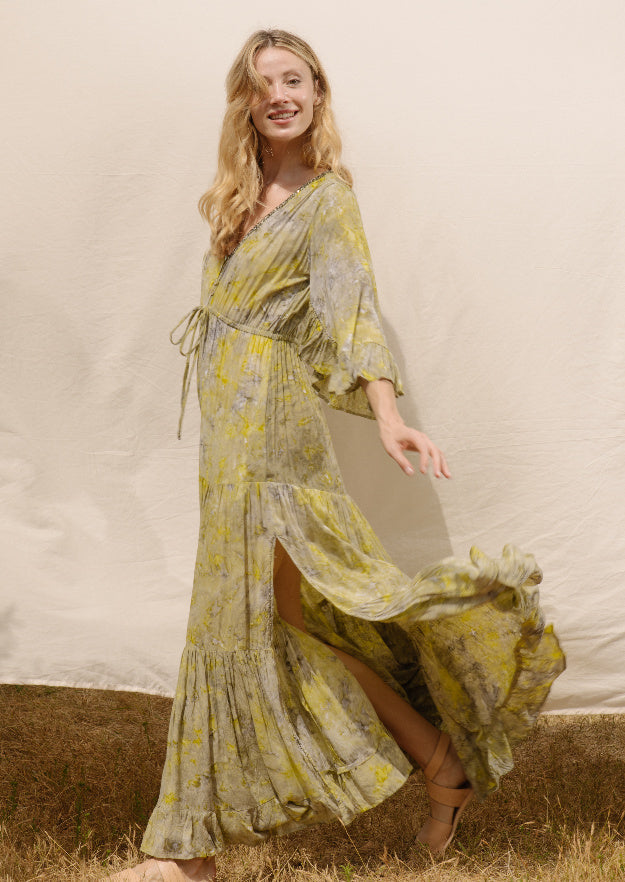 This dress has a unique handmade finish on the sleeves and bottom. At any time of the day, you will be covered by this Mystic print and won't even feel it, thanks to how incredibly delicate it is. Made from Crepe Rayon, that feels soft and cooling against your skin.