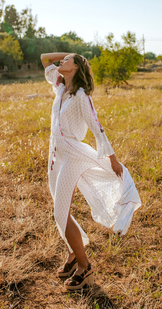 Wrap yourself in style in Long Abril Tunic. This long dress oozes elegance and class.Made from the highest quality rayon, she features glamorous open butterfly sleeves and richly embellished hem and neckline, this stylish tunic will never get overlooked and is effortlessly sexy.