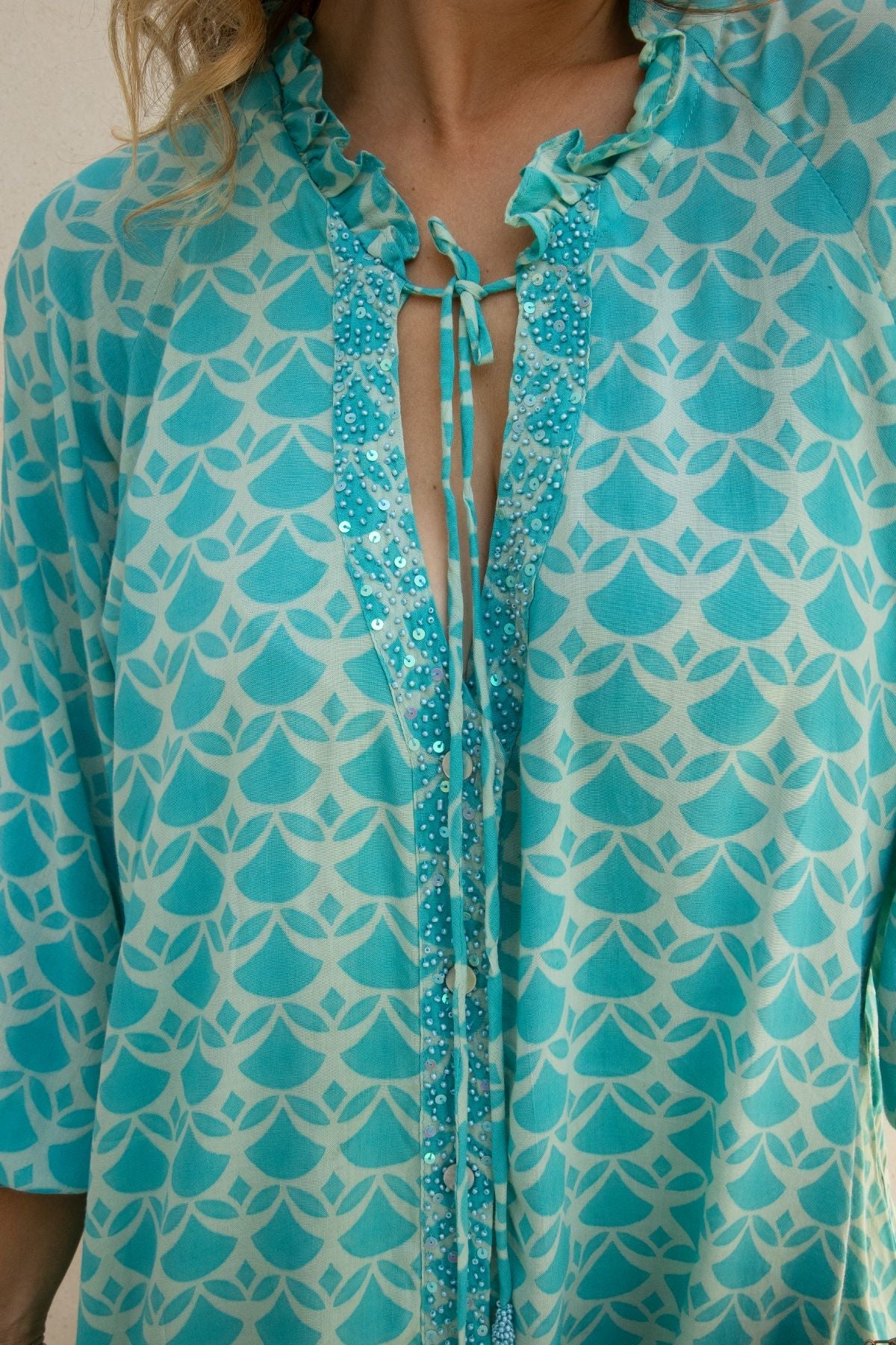 The Merle blouse epitomizes the essence of boho chic style with a touch of relaxed elegance. Crafted from luxurious rayon voile, this blouse is incredibly soft to the touch and exudes a sense of lightness and fluidity. Its unique design features delicate embroidered details and a fluid silhouette that flatters your figure. Available in color Aqua, Beige and Pink.