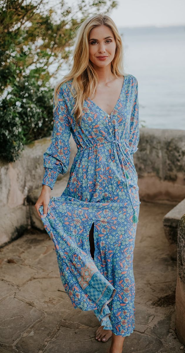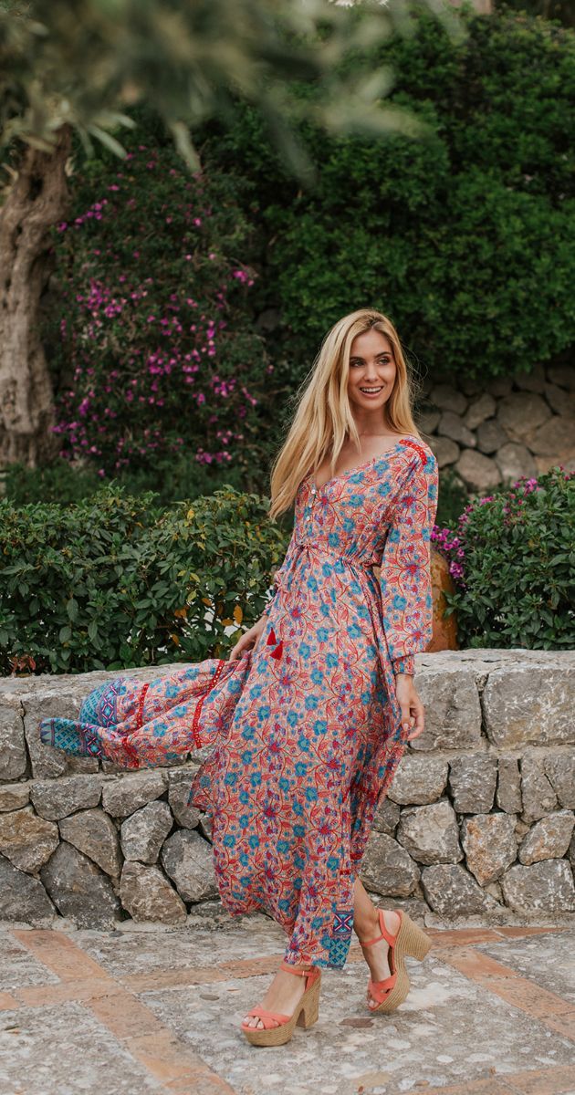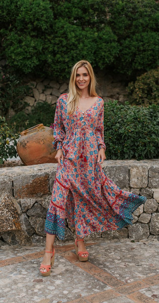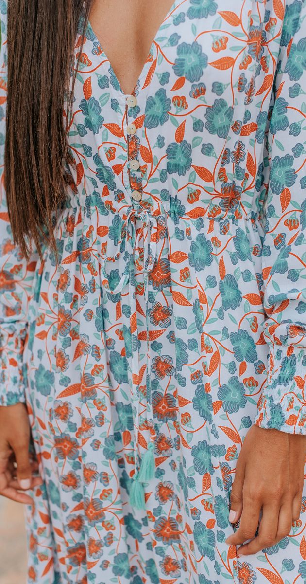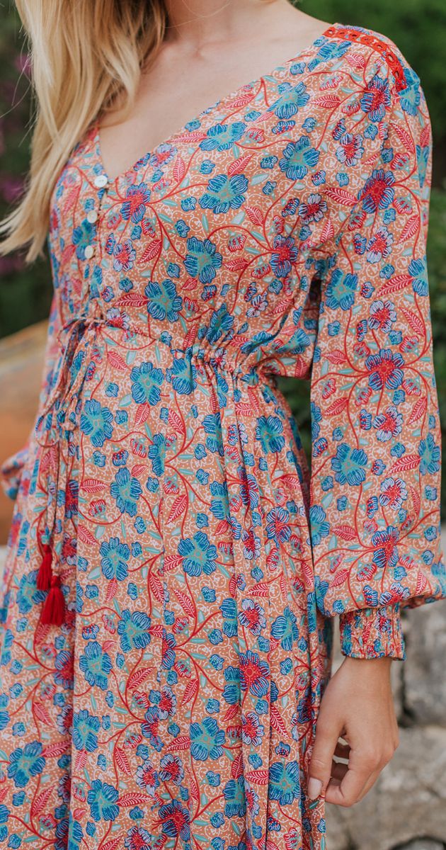 La tunique sexy boho Minerva est un hommage aux vraies filles des années 1960 dont les tissus à fleurs et aux couleurs vives ont créé le style Hippy Chick. Une tunique décontractée mais élégante avec un devant boutonné et un cordon de taille réglable avec de jolis pompons.