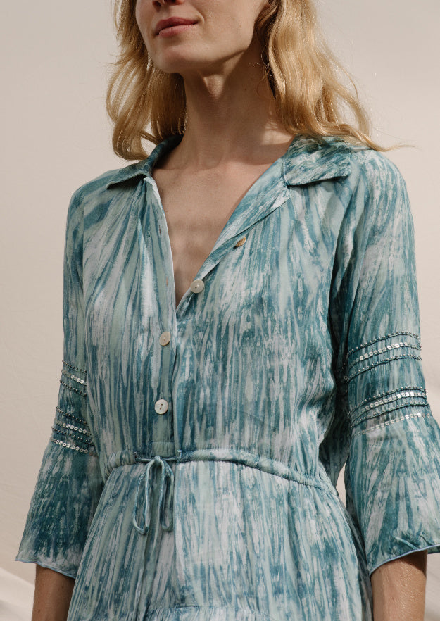 Our Noa Shirt Dress is the perfect summer selection. Individually hand dyed in a bespoke Duende Tie print, available in two striking tones of Pink and Light Blue. This piece eatures one of the boho chic fashion's most popular cuts. Like a shirt, it buttons up the front and can be used completely open or not. You can adjust the waist area to further enhance your figure. It is made of soft, light, cool, and comfortable rayon voile. It also includes handmade decoration work, giving it an elegant and exclusive touch