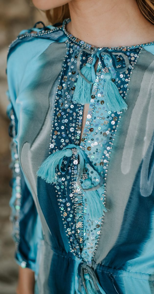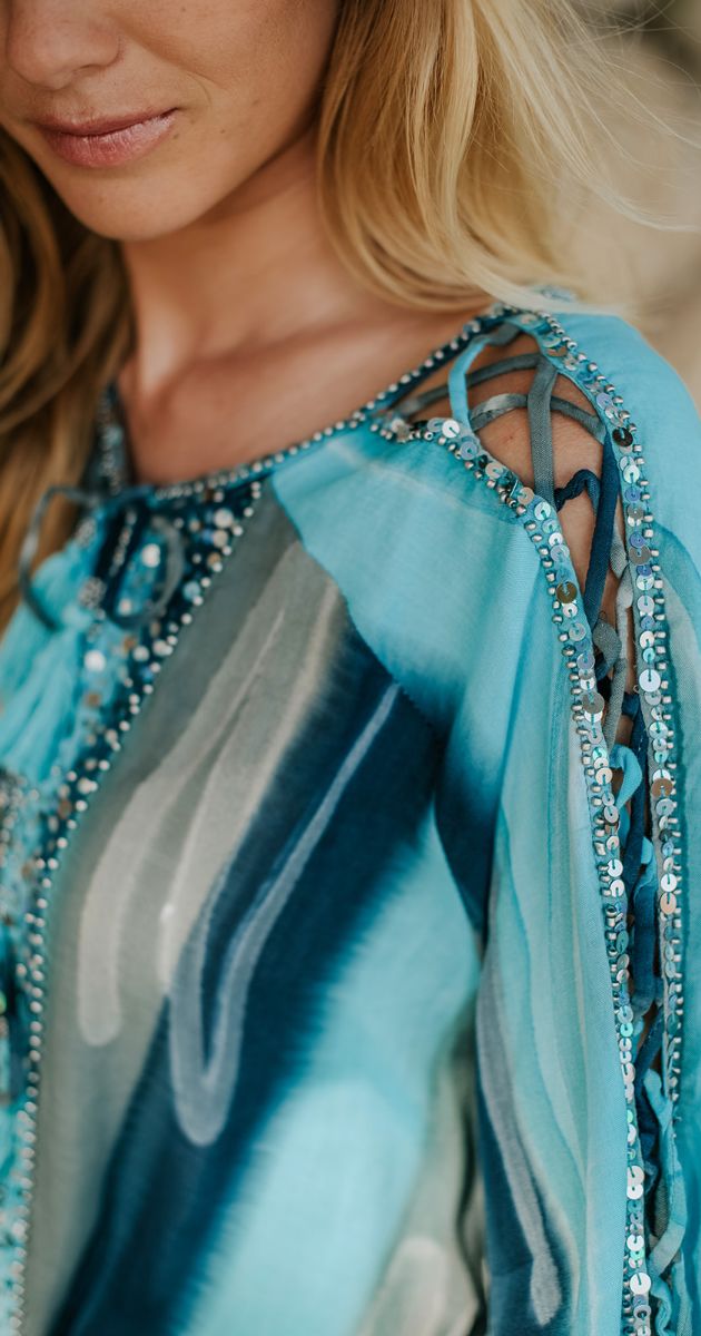 présente des manches tressées ouvertes et glamour, un ourlet et un col richement embellis, ainsi qu'une ouverture en trou de serrure ajustable pour montrer autant ou moins que vous le souhaitez. Cette tunique élégante ne passera jamais inaperçue et est sexy sans effort.