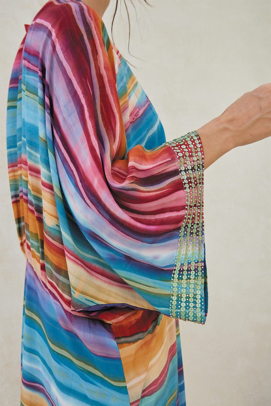 The Odyssey Kimono Top blends tribal edge with effortless flow. Featuring wide sleeves and an open cut, it’s available in Striped Savanna Tie Dye: multicolor with bold, nomadic energy.