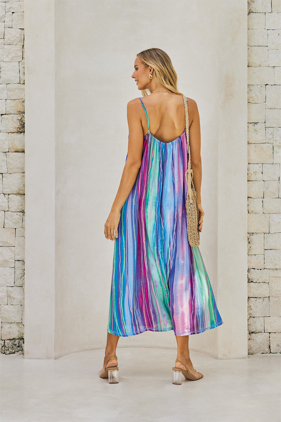 The Pantheon Long Dress in Ethereals Tie Dye is fluid, bright and soulful. With deep blue and multicolor hues, its flowing silhouette and open back make it ideal for sun-filled escapes.