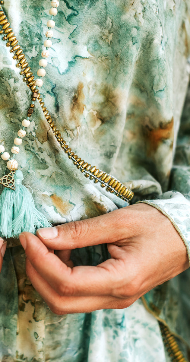 It comes in Blue with silver beading or in a Green/Yellow tone with gold beading.