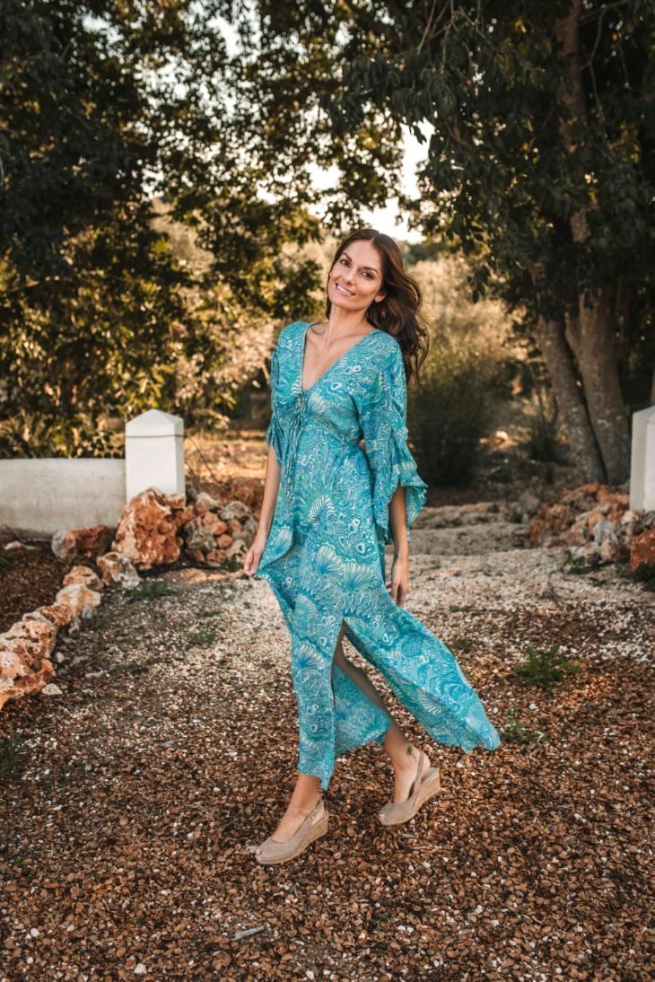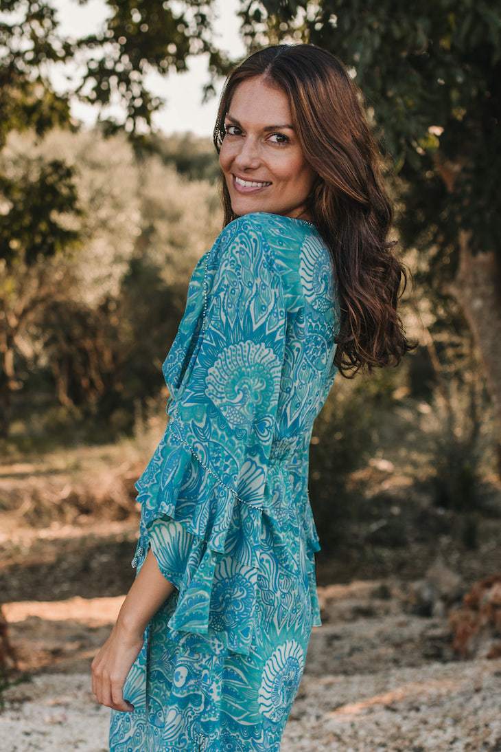 Notre caftan Venus est l'image même de l'élégance méditerranéenne. Ses manches à volants superbement superposées et sa taille ajustable par cordon de serrage lui confèrent une classe bohème moderne.