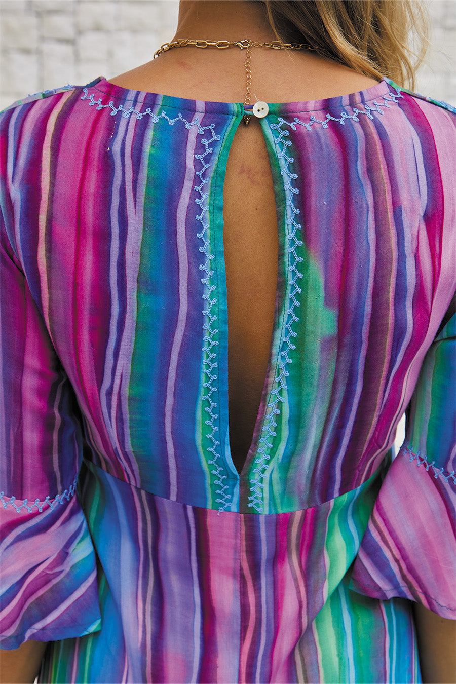 The Violette Long Tunic in Ethereals Tie Dye is bright, light and full of movement. Its blue-green-violet palette flows effortlessly, while the handcrafted sequin embroidery around the neckline adds a refined bohemian touch.