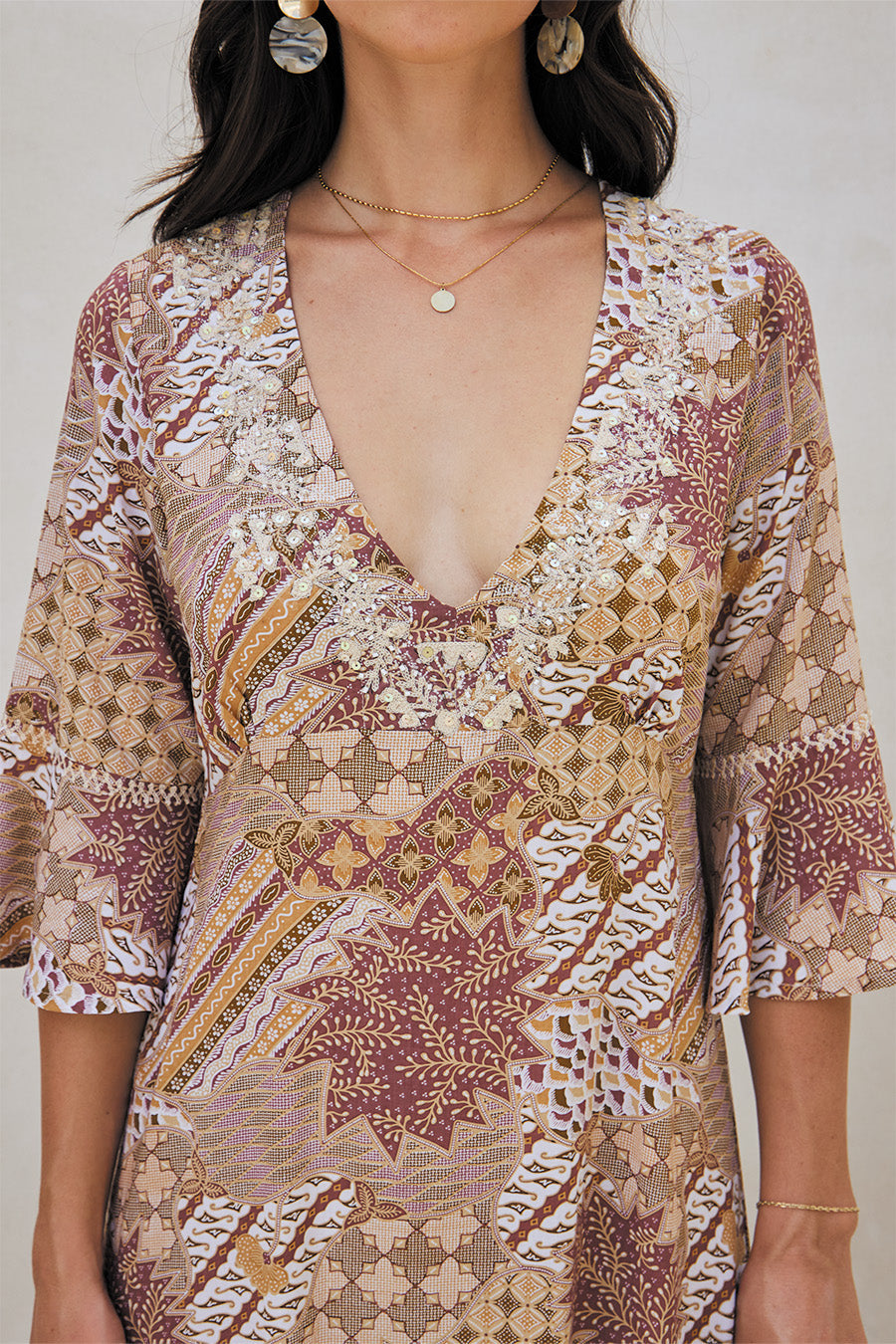 The Violette Long Tunic blends vintage softness with artisanal charm. With its buttoned V neckline, embroidered details and longline silhouette, it’s perfect as a tunic or a flowy dress.