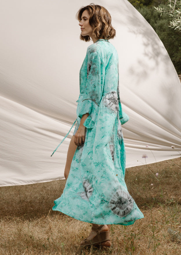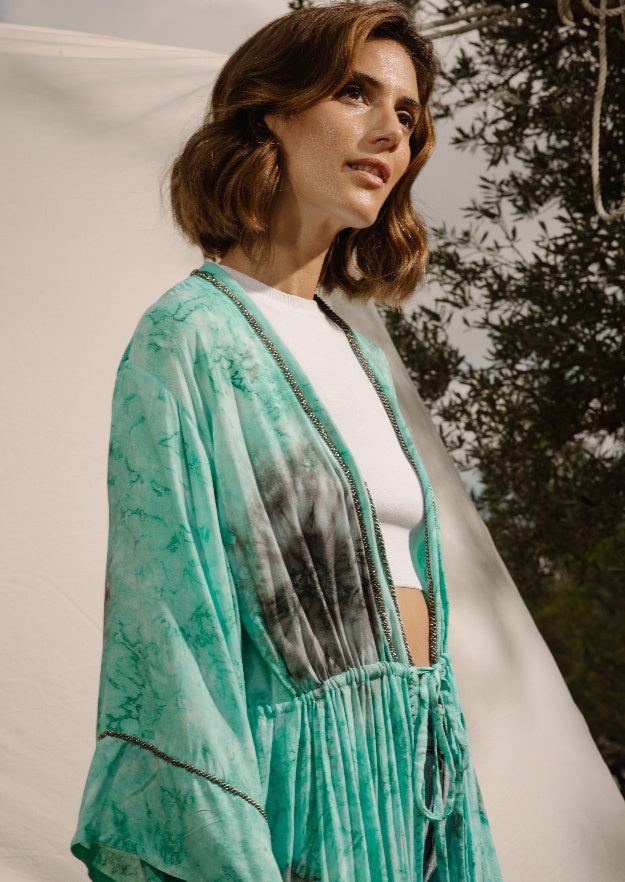 This versatile garment is designed to effortlessly transform your entire outfit, adding a touch of bohemian elegance and a burst of vibrant style. The length of the kimono provides a graceful and flowing silhouette, adding an element of drama and sophistication