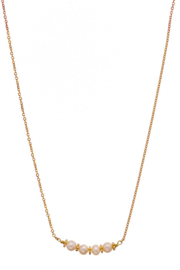 This 18k gold plated silver necklace with 5 beautiful pearls, separated by little 925 silver flowers in gold, has the energy and the essence of elegant sophistication. Together with the Audrey bracelet, or the Pearl Galore Bracelet these combination sets will make you feel like a timeless Hollywood movie star like Audrey Hepburn.