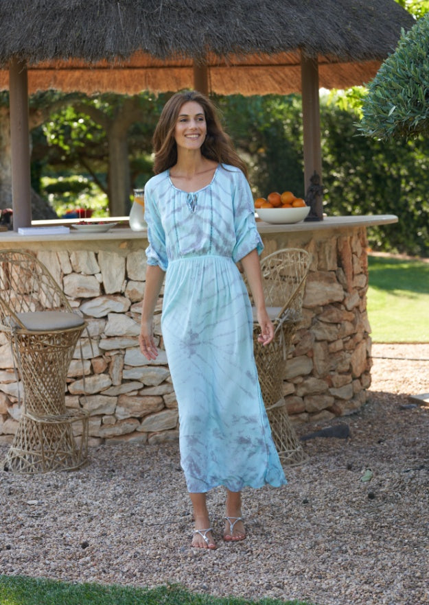 Add a bit of shimmer and sparkle to your day with Bella Kaftan. Worn over your bikini for a day at the beach, pool or for that last•minute picnic, paired up with your favourite flip-flops. The very soft and flattering shape and our delicate Bassa Tie Dye fabric, make this long dress a sure favourite on hot summer days.