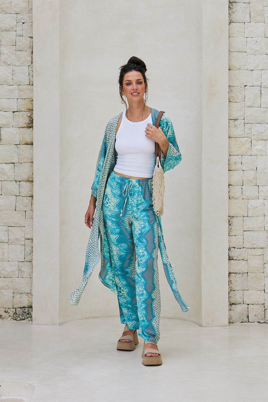The Dahlia Kimono in Snake Lux Print is sleek, bold and full of attitude. With its fluid cut and soft blue/grey tones, it's perfect for layering with effortless elegance.