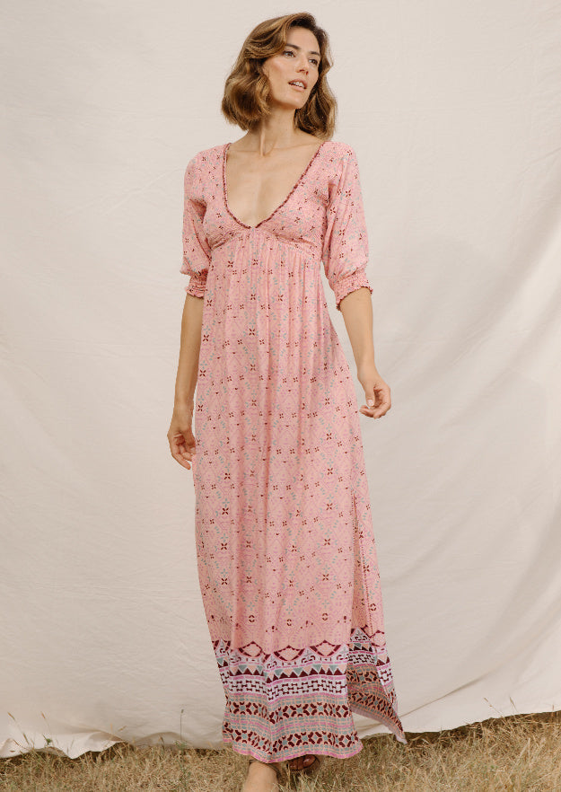 Introducing our breathtaking "Dulce Long Dress" adorned in a captivating Folk Print, designed to enchant and inspire. This remarkable dress combines the perfect blend of bohemian allure and contemporary elegance, making it a truly standout piece.