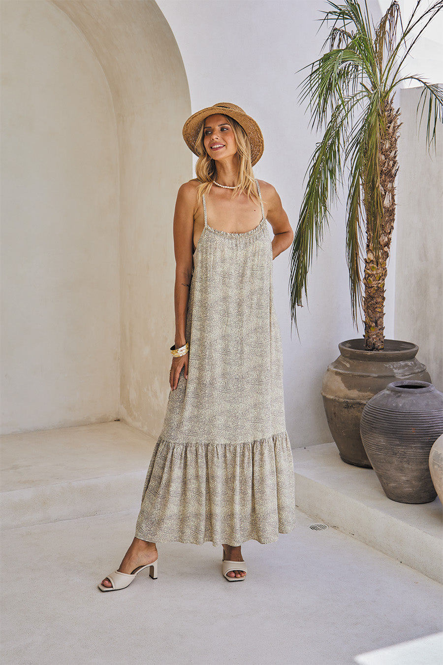 The Ember Set is a statement in movement and elegance. Featuring a sleeveless long dress and matching lycra bra, it’s ideal for summer escapes. The lightweight Mystical Print, available in Aqua or Beige, enhances the flowing silhouette and adds a dreamy touch.
