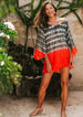 Another beautiful piece from our hand-dyed collection is the Rocio short kaftan Featuring open shoulders, a white Shibori pattern across the top section and beautiful and a vibrant Aqua coloured or a watermelon red colour at the end.