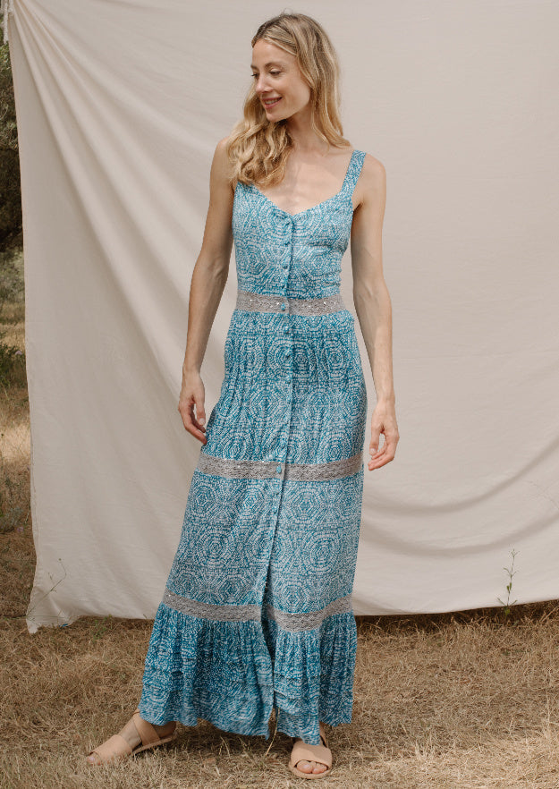 The Lyric Dress embraces a sense of whimsy and individuality with its special pattern, carefully designed to capture attention and evoke a sense of wonder. The Dadivosa Print is a work of art, with its intricate details and captivating colors that create a visual feast for the eyes.