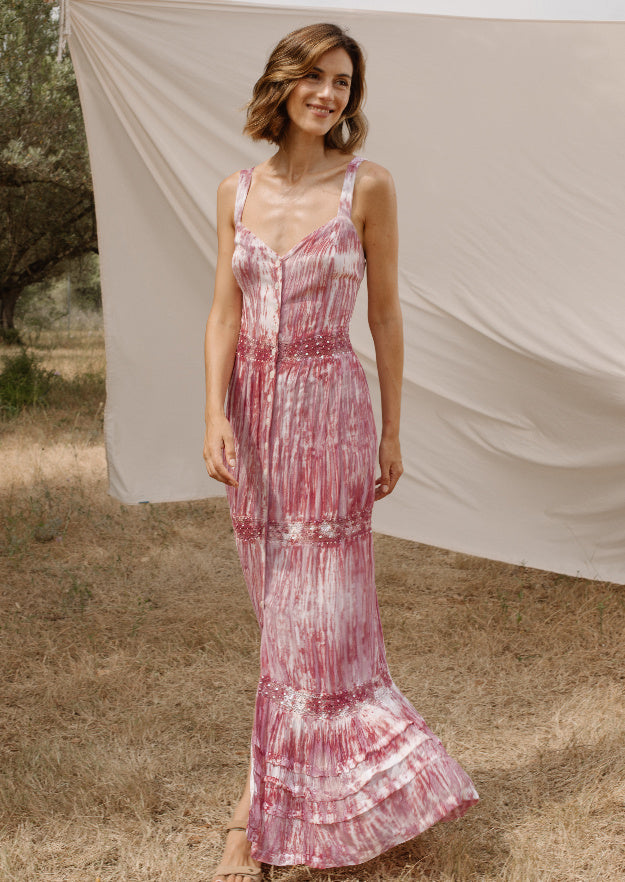 Radiate bohemian beauty in our Lyric Dress in Duende Tie print. This lovely piece is made from ultra-soft Rayon that is breathable and has a cooling effect. Combine this dress with sandals or even heels to reaffirm your posture. With a line of buttons on the front, chest and back uncovered. Use it with confidence whenever you want. It also has a detailed handcrafted work, addingn elegant and exclusive touch.