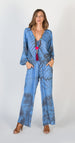 The Arathya boho-chic jumpsuit is a piece with a handmade Baltik print in apricot blue tones.