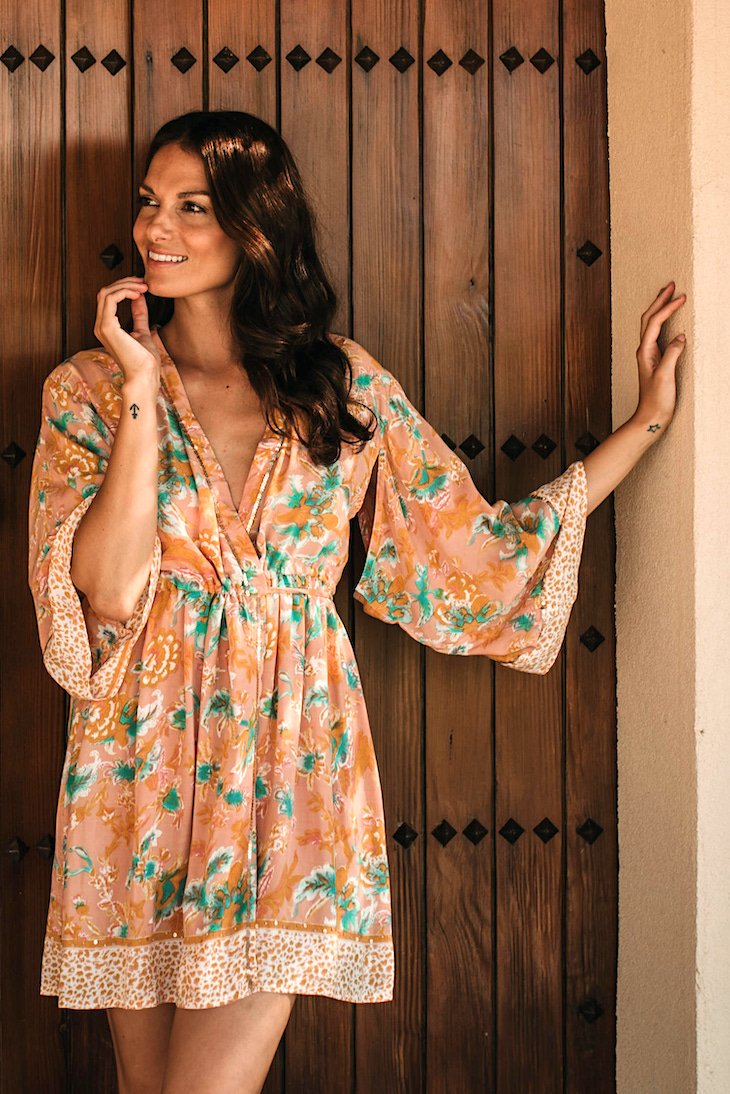 Our Odina Kimono Sundress is popular among the Hippy Chick Ibiza community. With mid-length sleeves, available in two shades of blue or nude with gorgeous terracotta flower print. Made from the softest Rayon, so not only do you look amazing but you feel amazing too. The adjustable wrap-around tie draws in at the waist, accomodating two independent looks; sundress goddess or classic kimono style. For beach chic, pair with your favorite sandals and floppy hat.