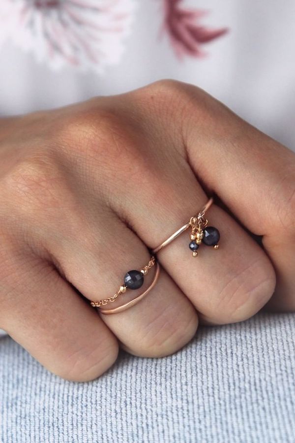 Let us show you this 925 Silver chain ring in galvanic 18k rosé gold, adorned with a facetted green Agate or Sapphire. Together with this gorgious ring, goes the beautiful Sapphira Bracelet for maximum effect.
