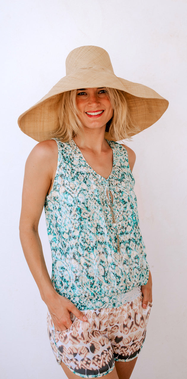 Sporty Lucy jumpsuit is a sleeveless outfit with cute shorts attached. Featuring a beautiful two-tone print it creates the illusion of a separate blouse and shorts. Featuring a flattering V neck that is tied at the front and an unusual open back with a large keyhole opening to adjust at the top. Made from the softest rayon, it comes in 2 different tones, Green/ Turquoise and Green/ Beige.