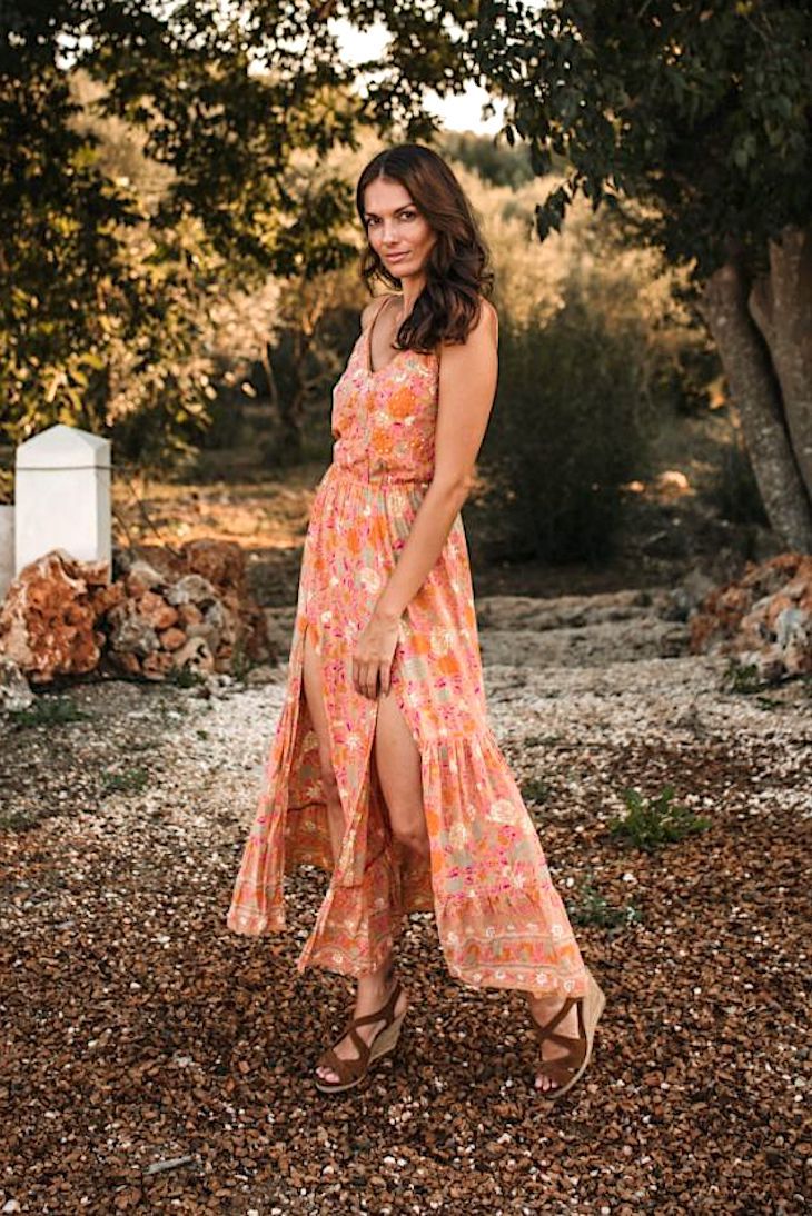 Our Starlight Long Dress, with sexy double front slits, is a show-stopping number. Choose from two tones of Apricot and White in our gorgeous Terracotta Flower print. Beautifully handcrafted with exaggerated ties, that can be tied at the back in a multitude of ways, to achieve several different looks. Made from ultra-soft Rayon, with divine hand-embellished beading.