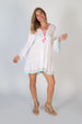 Ibiza tunic in white with turquoise and pink embroidery. A comfortable and elegant summer garment with a boho-chic touch.