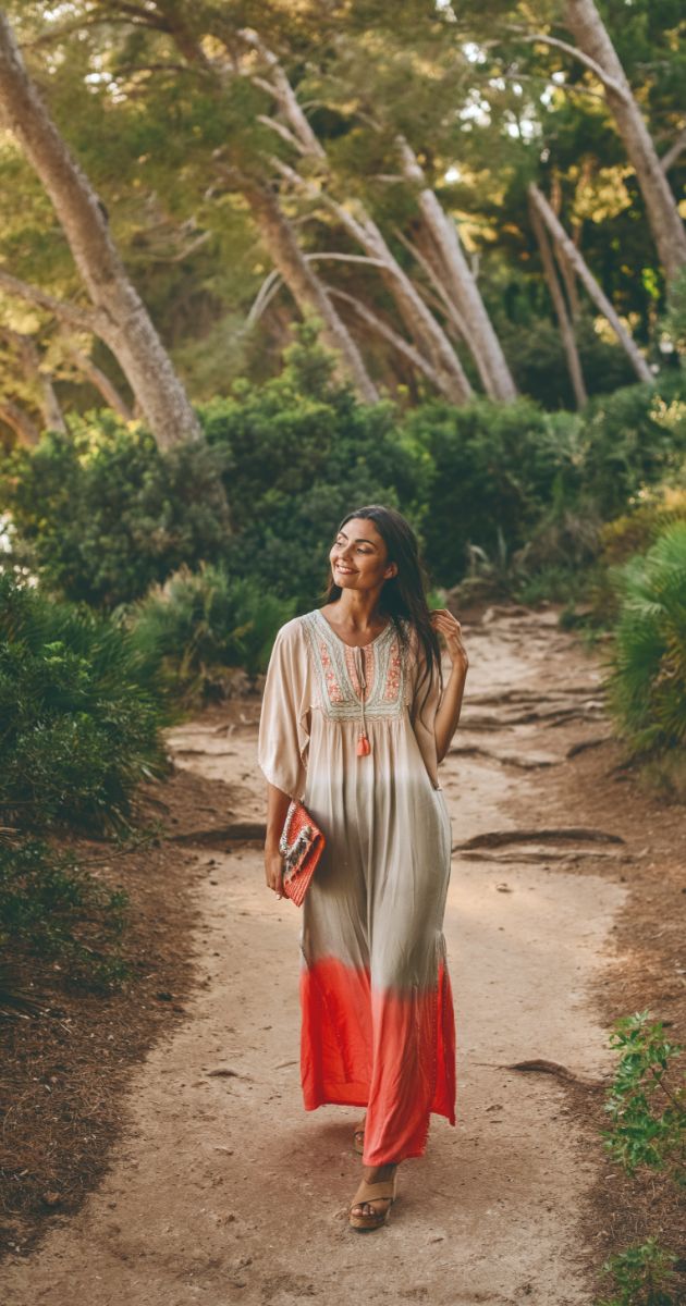 This Vera Kaftan is the long version of the Vega long Tunic, a beautiful, hand-dyed tunic in batik degraded style to hit the town or go to your favourite festival! This blouse with open winged sleeves and a richly embroidered chest is a daring creation that will surely turn some heads. It comes in an Aqua and a Coral coloured variation.