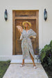 The Gypsy set is a statement in movement and color. Featuring a flowy kimono and matching top in a vibrant pink-and-black psychedelic print, both trimmed with handcrafted lace, it’s made to mix, match and move freely.