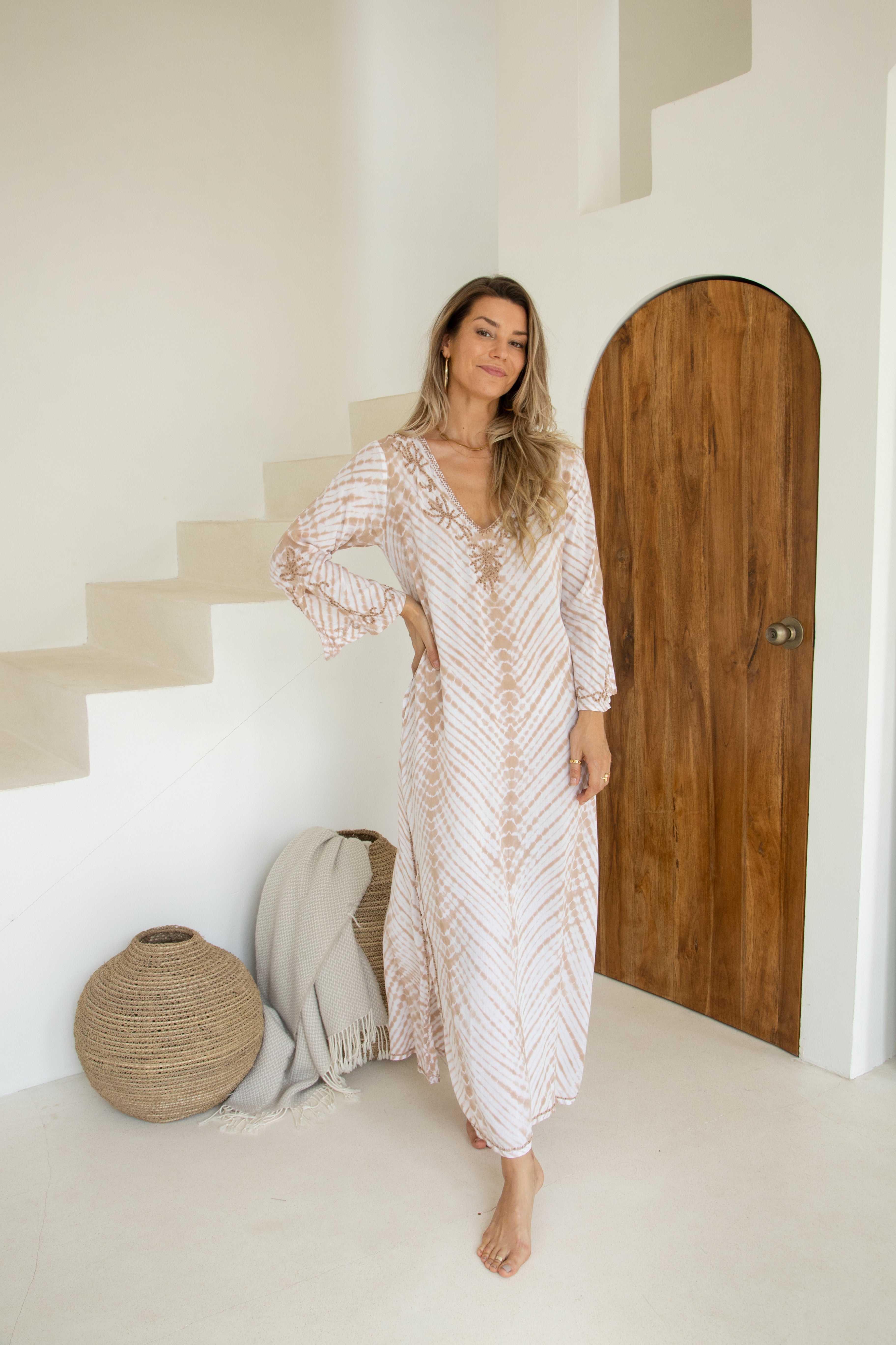 Introducing our Yalena Long Kaftan, a statement piece that will turn heads this season. Crafted for the free-spirited women of Ibiza, this kaftan embodies elegance and sophistication, perfect for those balmy summer days and nights.